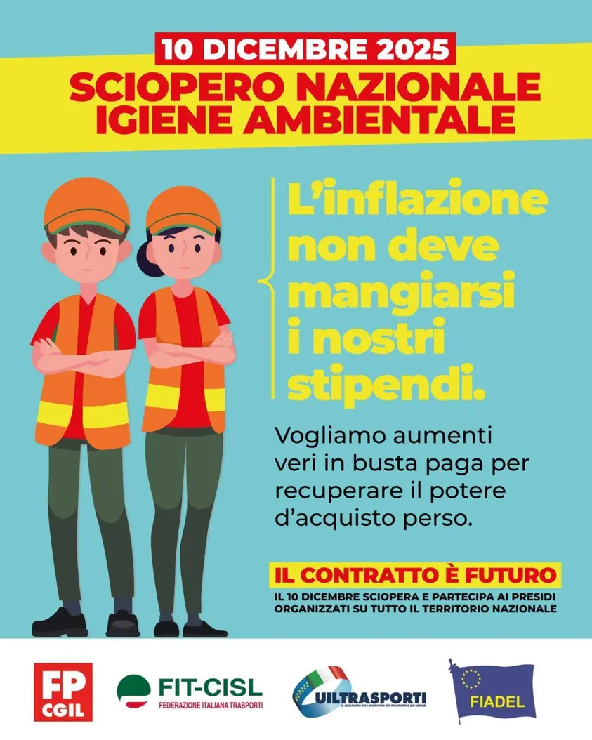 𝐃𝐎𝐌𝐀𝐍𝐈 𝟏𝟎 𝐃𝐈𝐂𝐄𝐌𝐁𝐑𝐄 𝟐𝟎𝟐𝟓 Sciopero Nazionale indetto dalle Organizzazioni Sindacali FP CGIL, FIT CISL, UILTRASPORTI e FIADEL, in relazione al perdurare delle criticità presenti nella trattativa per il rinnovo del CCNL unificato dei Servizi Ambientali 18 maggio 2022, scaduto il 31 dicembre 2024, e a