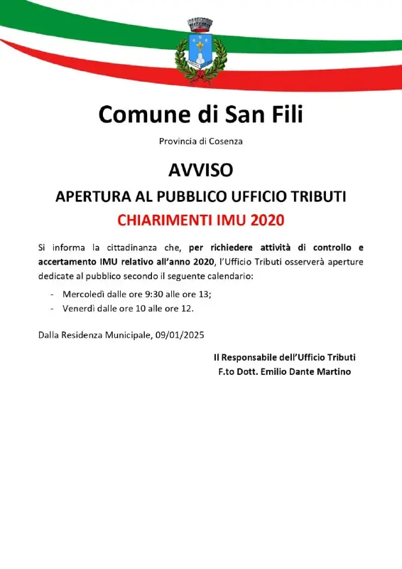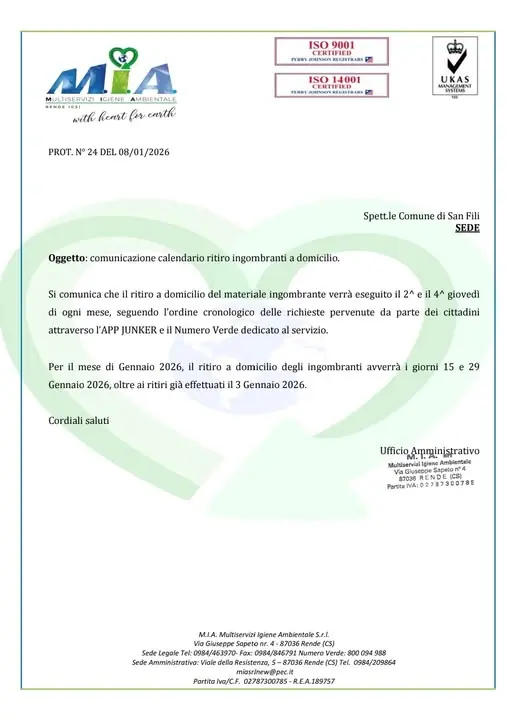 ๐๐ฏ๐ฏ๐ข๐ฌ๐จ - ๐๐ข๐ญ๐ข๐ซ๐จ ๐ซ๐ข๐๐ข๐ฎ๐ญ๐ข ๐ข๐ง๐ ๐จ๐ฆ๐๐ซ๐๐ง๐ญ๐ขSi informa la cittadinanza che il ritiro a domicilio dei rifiuti ingombranti viene effettuato il ๐ยฐ ๐ ๐ข๐ฅ ๐ยฐ ๐ ๐ข๐จ๐ฏ๐๐๐ขฬ ๐๐ข ๐จ๐ ๐ง๐ข ๐ฆ๐๐ฌ๐, secondo lโordine cronologico delle richieste pervenute.Per il mese di gennaio 2026, il servizio sarร svolto nei seguenti giorni:๐ gio